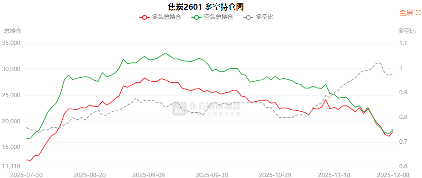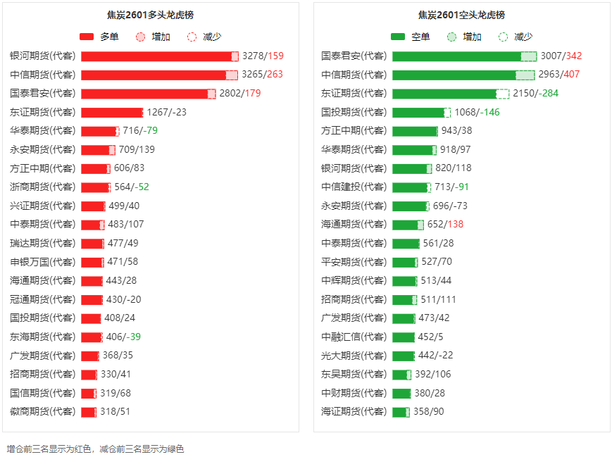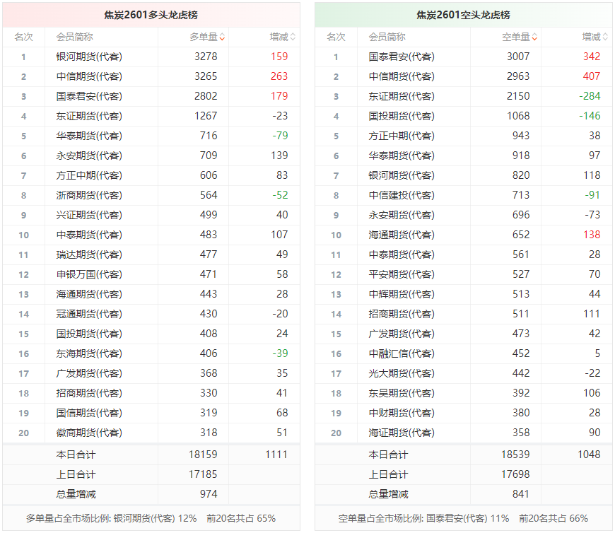 总体而言,焦炭2601合约今日增仓下行,多空持仓排名前20席中,多空双方均呈进场态势,多头进场意愿强于空头。